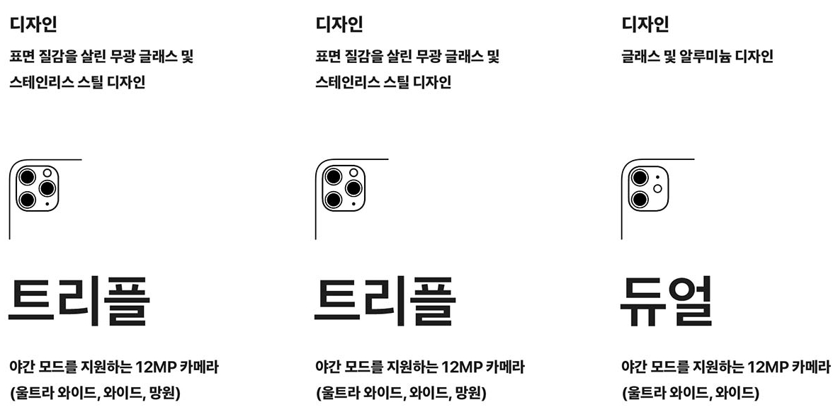망원렌즈가 빠져서 망원렌즈 기능이 꼭 필요하시다면 아이폰 11 프로쪽으로 넘어오셔야겠네요.