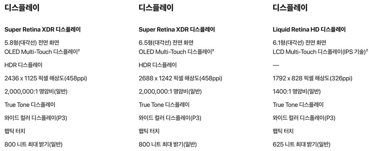 위에서 설명을 다 못했던 액정(디스플레이)도 이렇게 비교되어 있네요